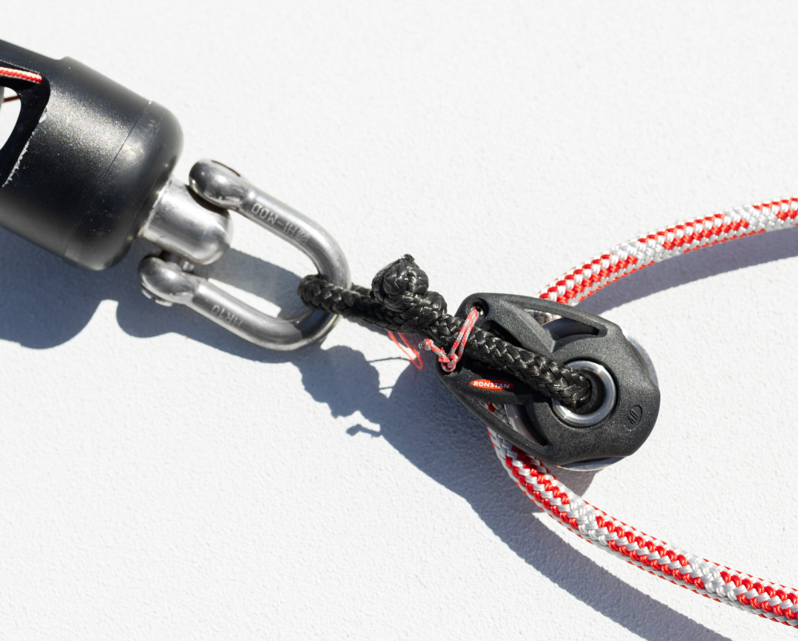 Il link in Dyneema® si monta facilmente ed è trattenuto in modo sicuro da una clip di fissaggio sagomata. Il collegamento flessibile può essere lasciato con un’estremità attaccata al bozzello durante il montaggio, senza la problematica di perdere i perni. Il sistema è compatibile con strop in Dyneema® e Spectra®, punti di connessione in carbonio, molto più adatti rispetto a fitting in acciaio.